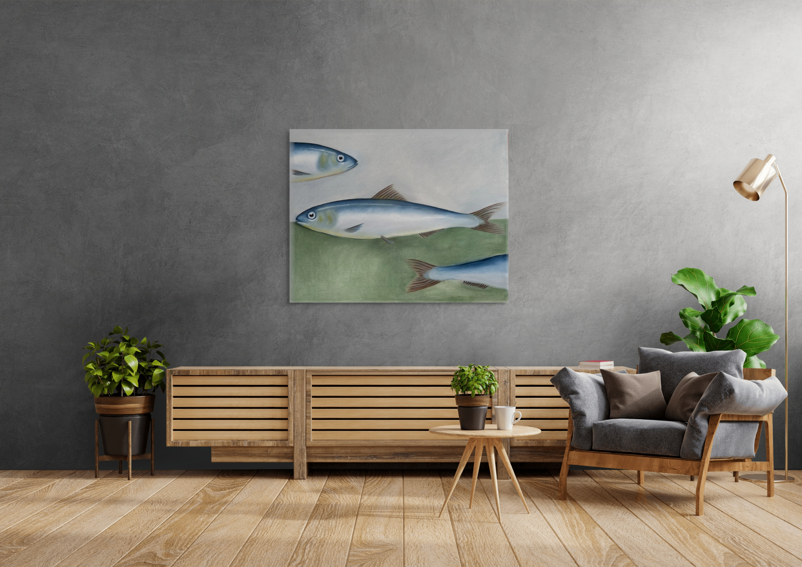 Each brushstroke balances realism with quiet abstraction, capturing not just the image of sardines, but the memory of salt air, sunlight, and the shared culture of the shoreline. This work invites contemplation — a still moment within movement, a reminder of nature’s quiet poetry.